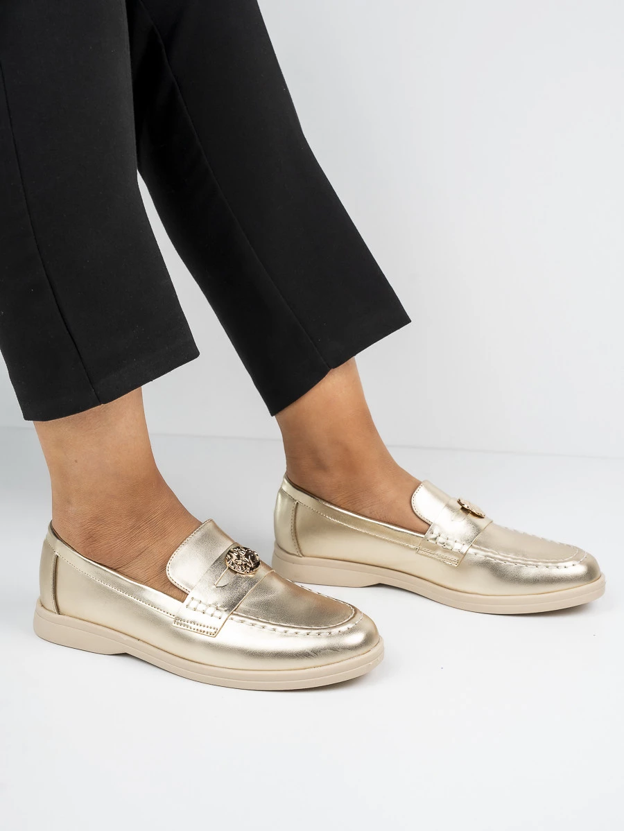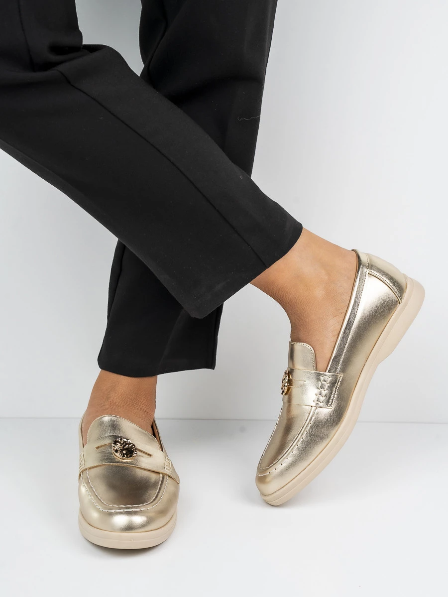 Mokasyny eleganckie ze złotą ozdobą w kolorze Gold
