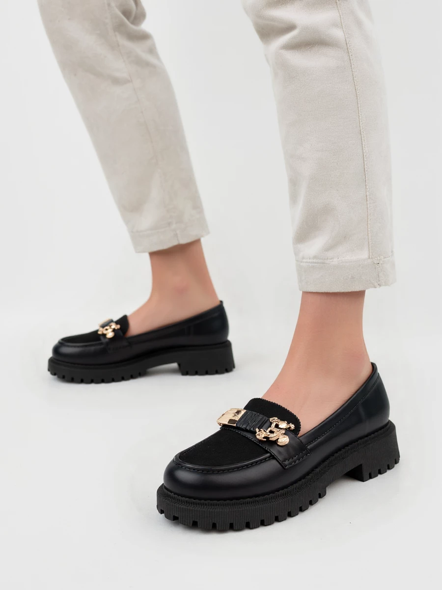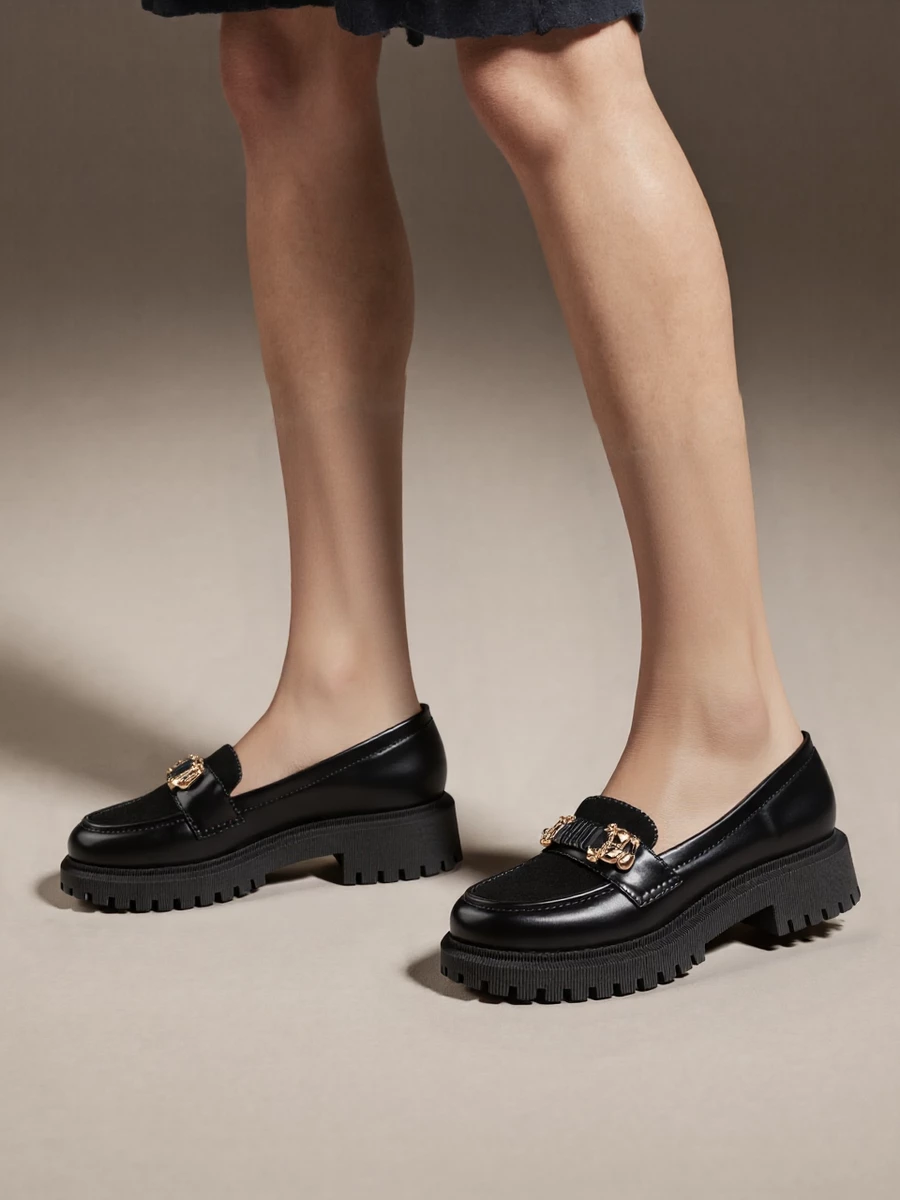 Eleganckie mokasyny Elegante Czarne idealnie nadają się na różnorodne okazje, od formalnych spotkań po casualowe wyjścia. Wyróżniają się klasycznym designem z dodatkiem nowoczesnej, masywnej podeszwy, która zapewnia stabilność i komfort użytkowania. Ozdobna klamra dodaje charakteru, a wysokiej jakości skóra zapewnia trwałość i łatwość w utrzymaniu.