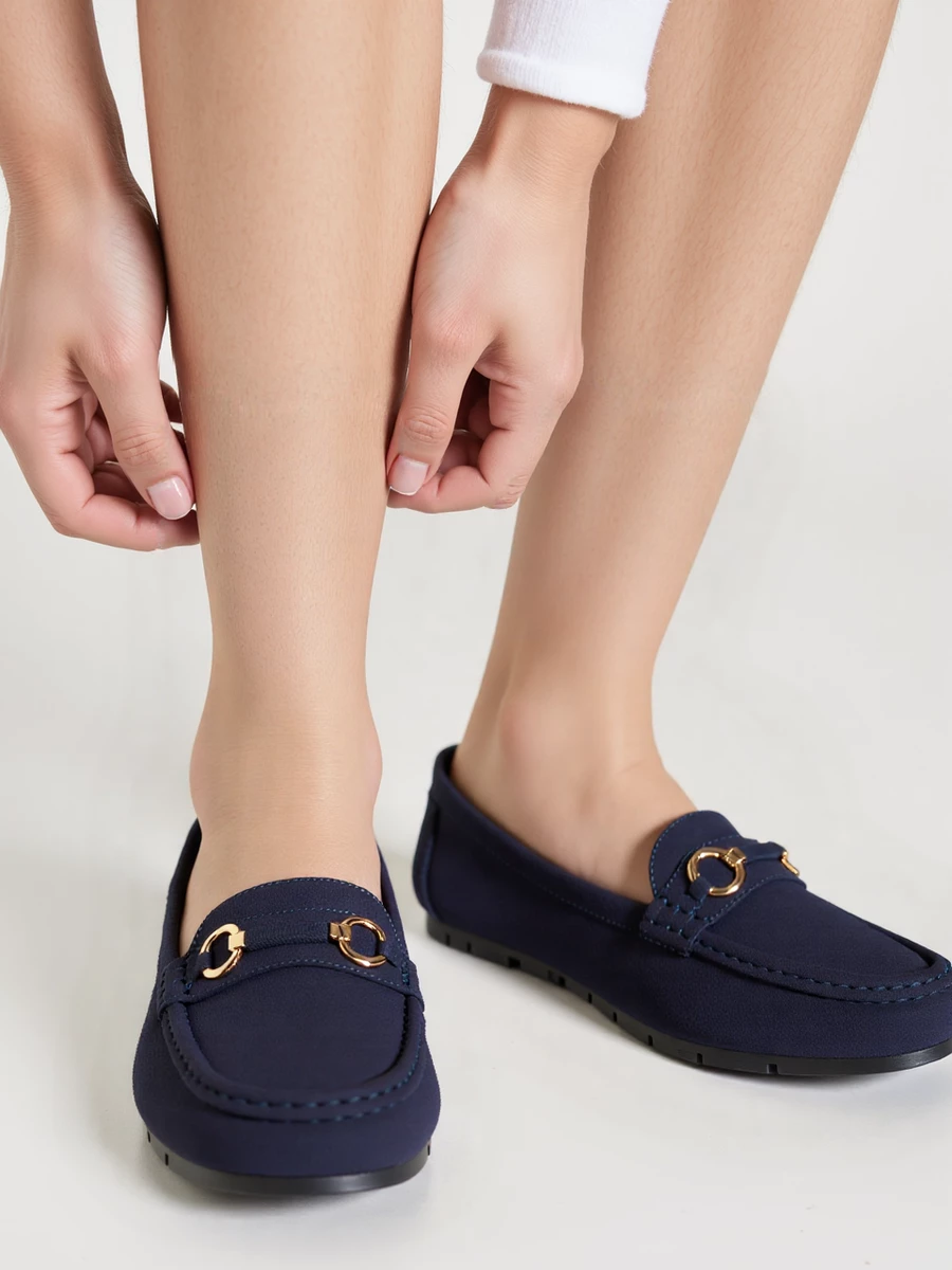 Mokasyny Elegante Granatowe to idealne połączenie elegancji i komfortu. Cechują się miękkim, zamszowym wierzchem w głębokim odcieniu granatu, uzupełniony o metalową klamerkę w kształcie serca, dodającą subtelny akcent luksusu. Elastyczna, gumowa podeszwa zapewnia komfort i przyczepność, sprawiając, że są to buty idealne zarówno na codzienne wyjścia, jak i na specjalne okazje.