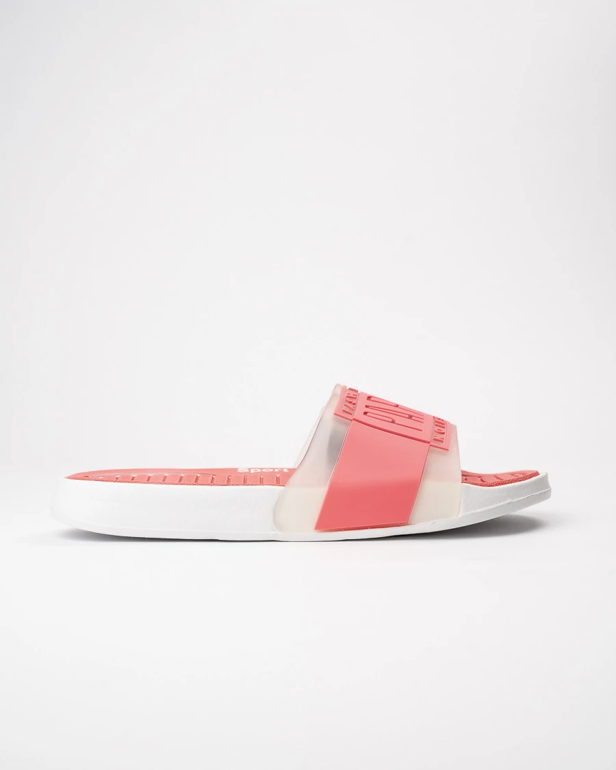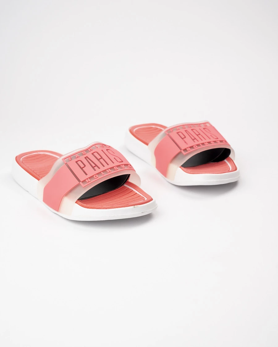 Te różowe klapki to idealny wybór na lato, łączący wygodę i styl. Szeroki pasek z przezroczystym akcentem i wyraźnym napisem „PARIS” nadaje im modnego, miejskiego charakteru. Profilowana podeszwa z miękkiego tworzywa dba o komfort i amortyzację podczas spacerów. Doskonałe na co dzień, do domu i na plażę.