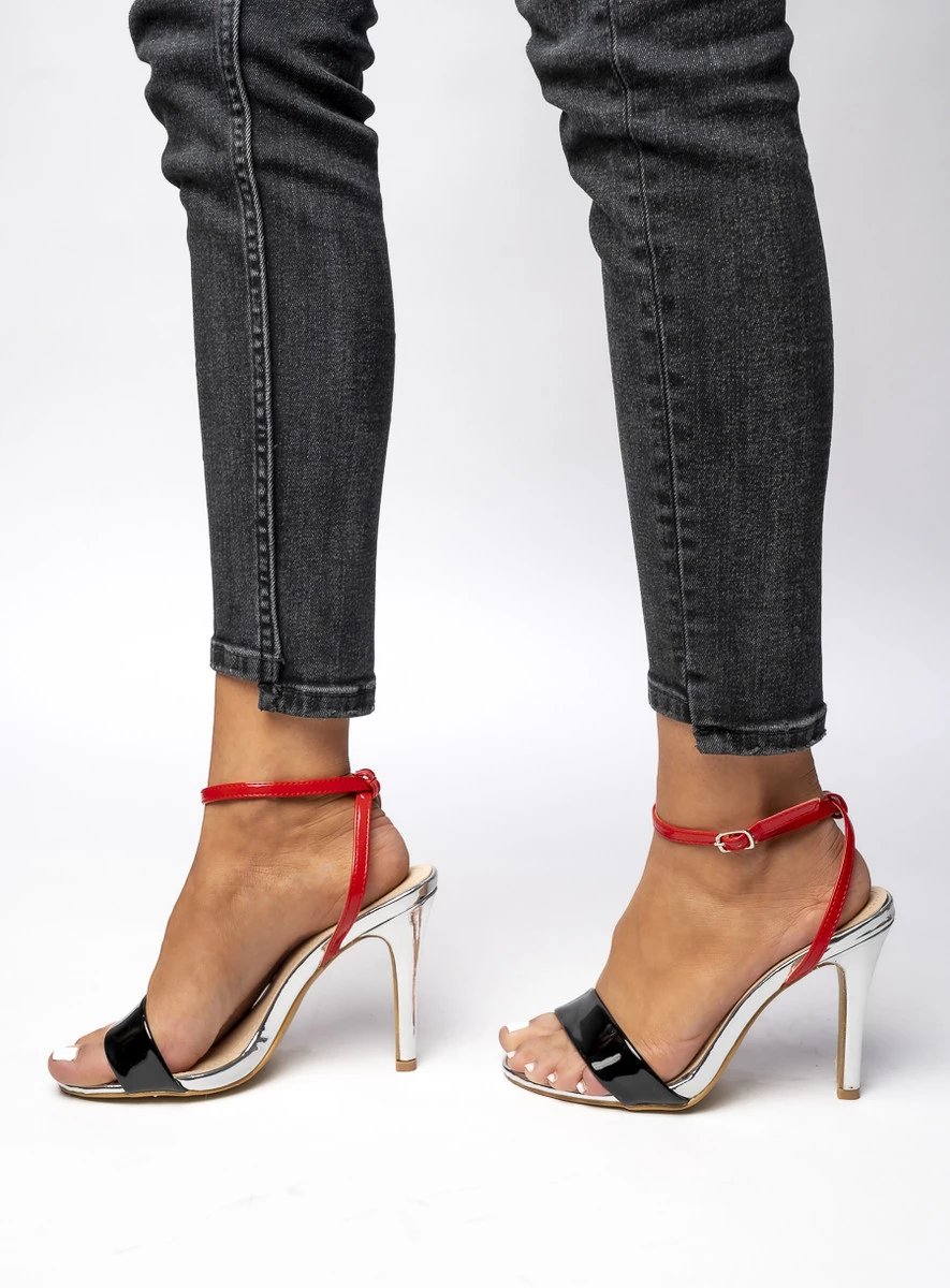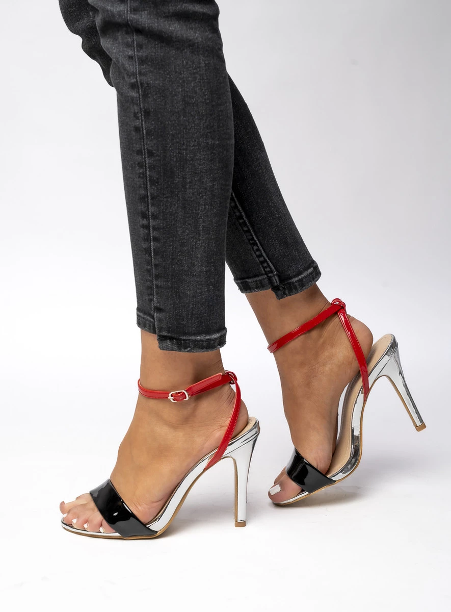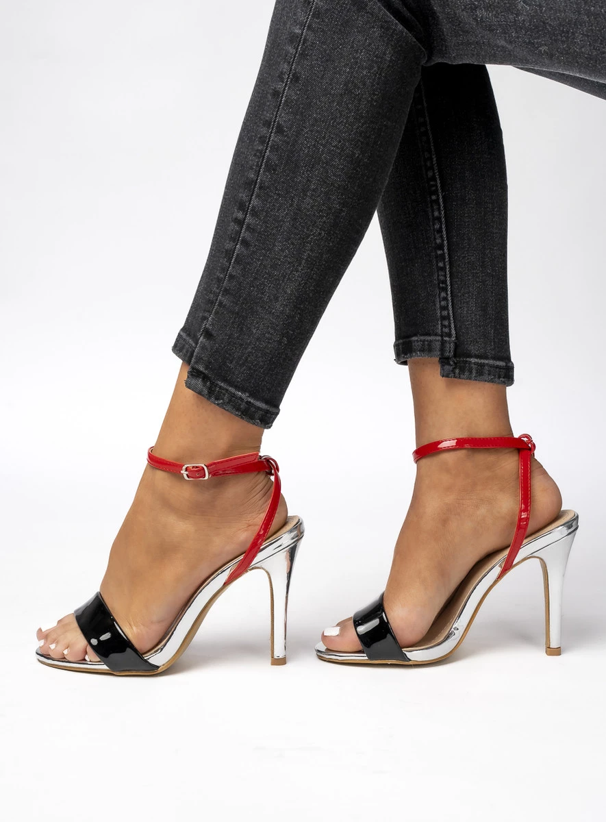 NILA BLACK to sandały na smukłej szpilce, które łączą klasykę z odważnym stylem. Połączenie lakierowanej czerni z czerwonym paskiem wokół kostki nadaje im wyjątkowego charakteru. Srebrna podeszwa oraz obcas dodają elegancji i sprawiają, że buty doskonale sprawdzą się na wyjątkowe okazje, wieczorne wyjścia czy eleganckie bankiety.