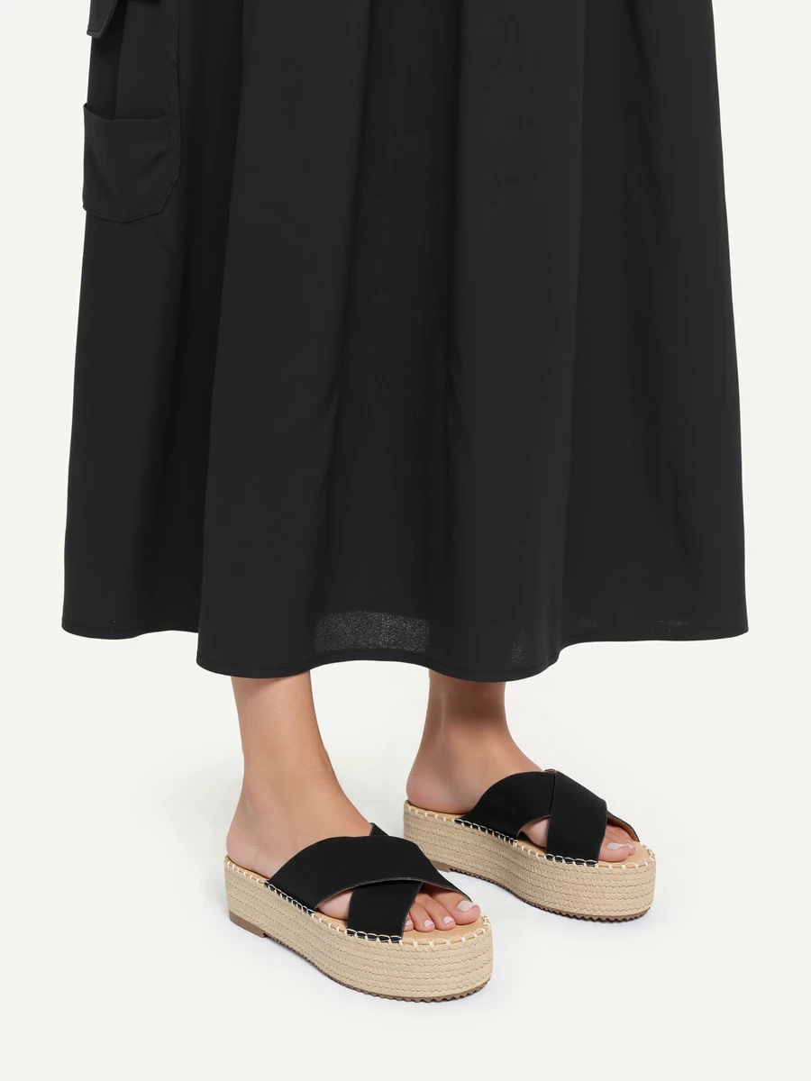 Te czarne sandały to idealne połączenie klasy i wygody. Stabilny, średniej wysokości obcas zapewnia komfort noszenia przez dłuższy czas, a finezyjne paski subtelnie zdobią stopę, podkreślając kobiecy charakter butów. Pasek na kostce z klamrą pozwala na idealne dopasowanie. Doskonałe na wieczorne wyjścia, spotkania i formalne okazje, dodając elegancji każdej stylizacji.