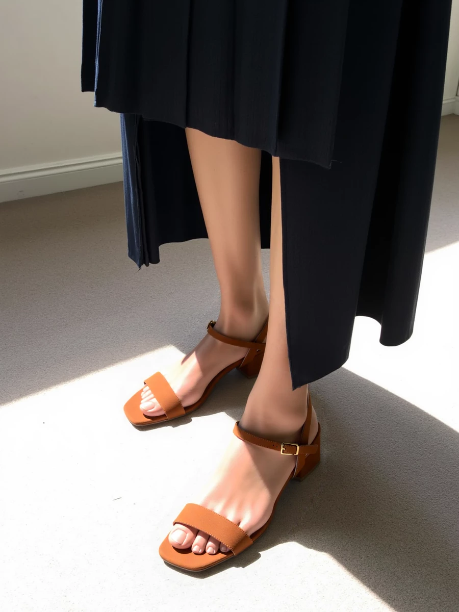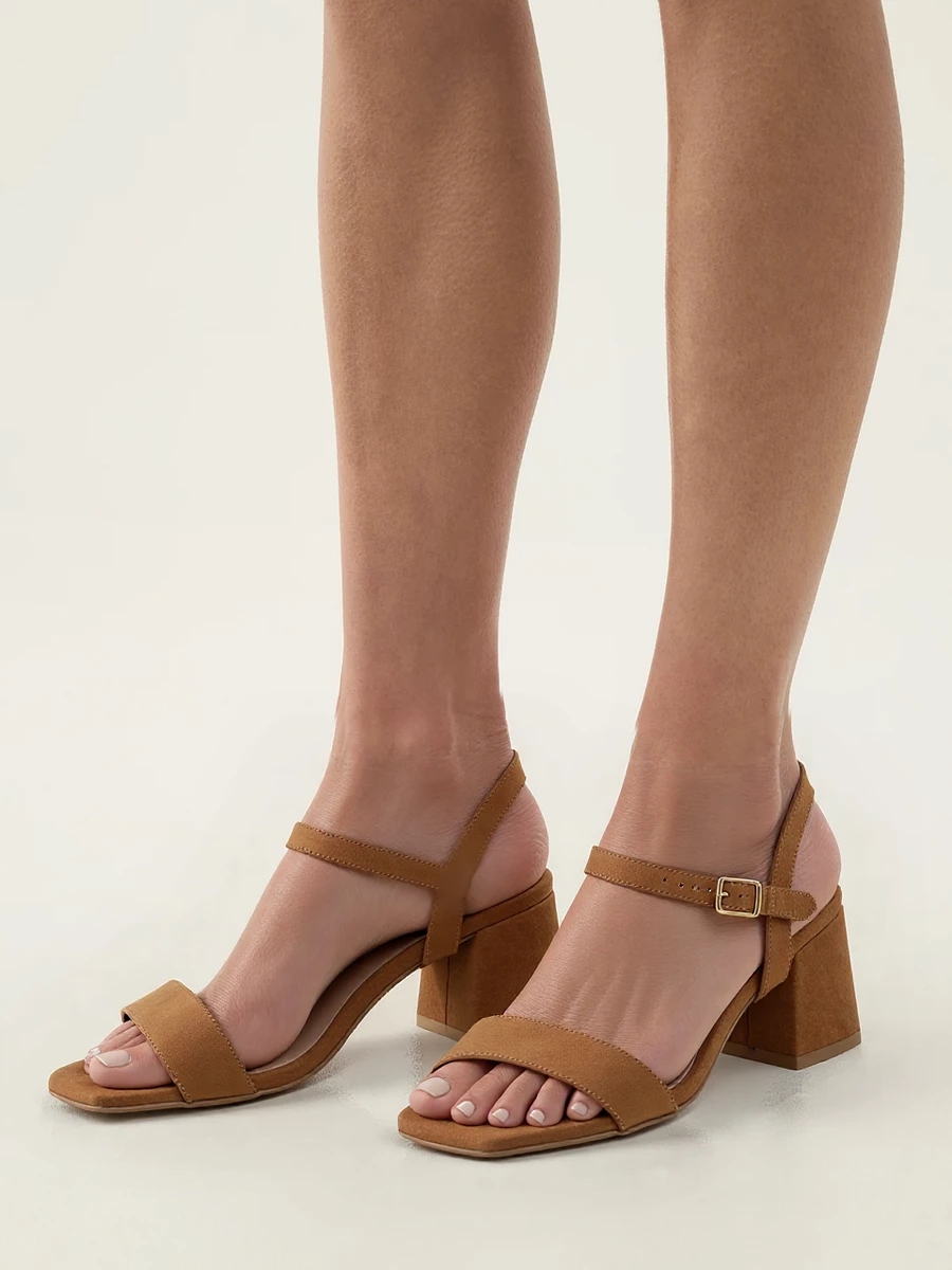 Wyrafinowane sandały na obcasie Elegancja Karmel łączą funkcjonalność z modnym designem. Idealne na wieczorne wyjścia czy specjalne okazje. Szerokie paski z zamszu delikatnie otulają stopę, zapewniając stabilność i komfort, a regulowane zapięcie na kostce umożliwia idealne dopasowanie.