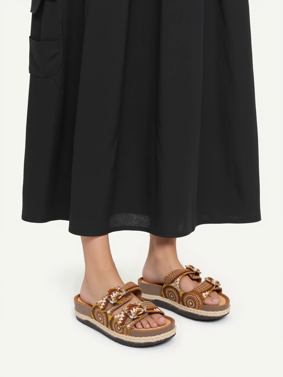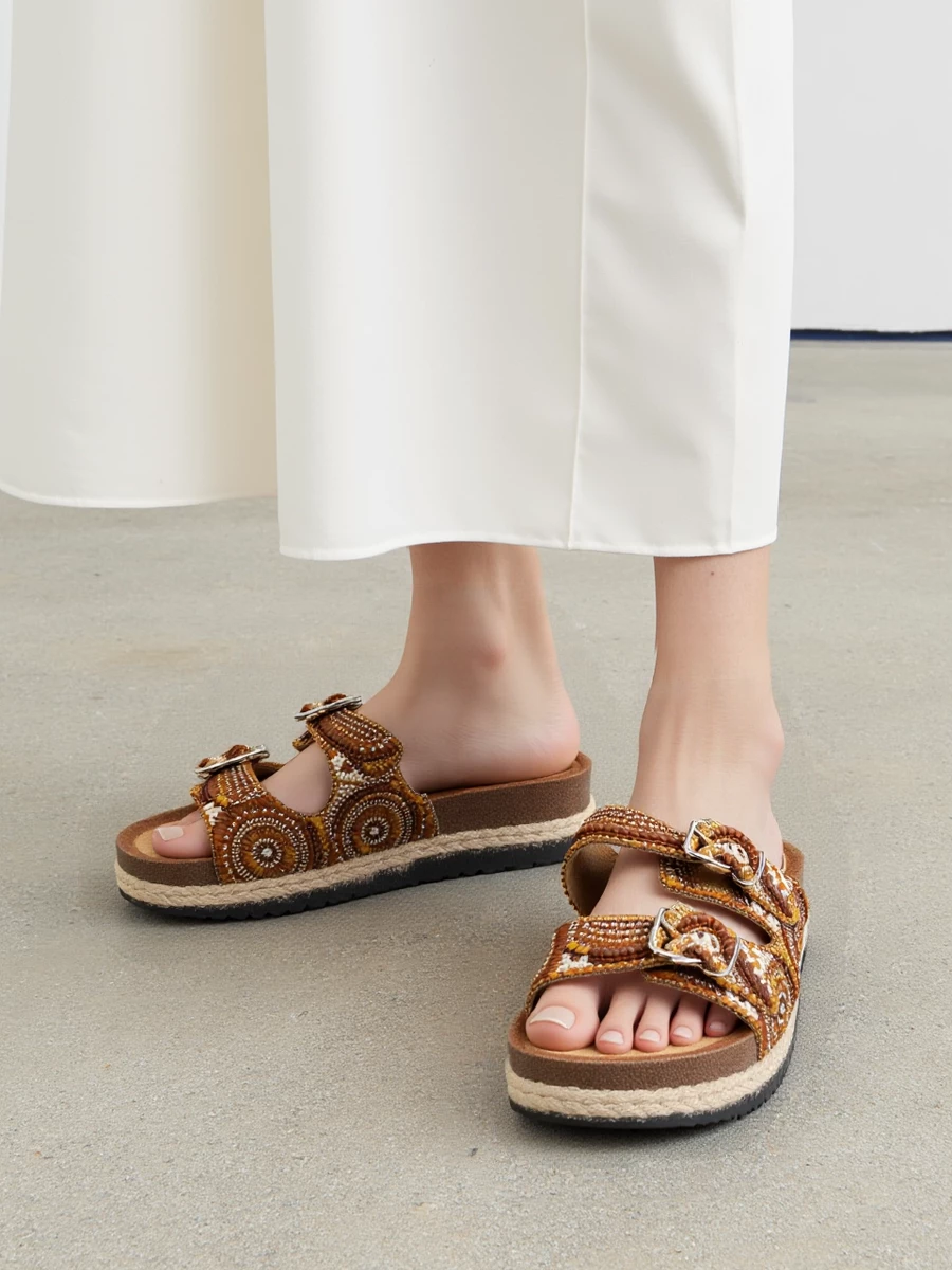 Idealne na letnie spacery, do stylizacji boho czy na festiwale. Podeszwa z naturalnego korka zapewnia komfort i wsparcie dla stóp przez cały dzień.