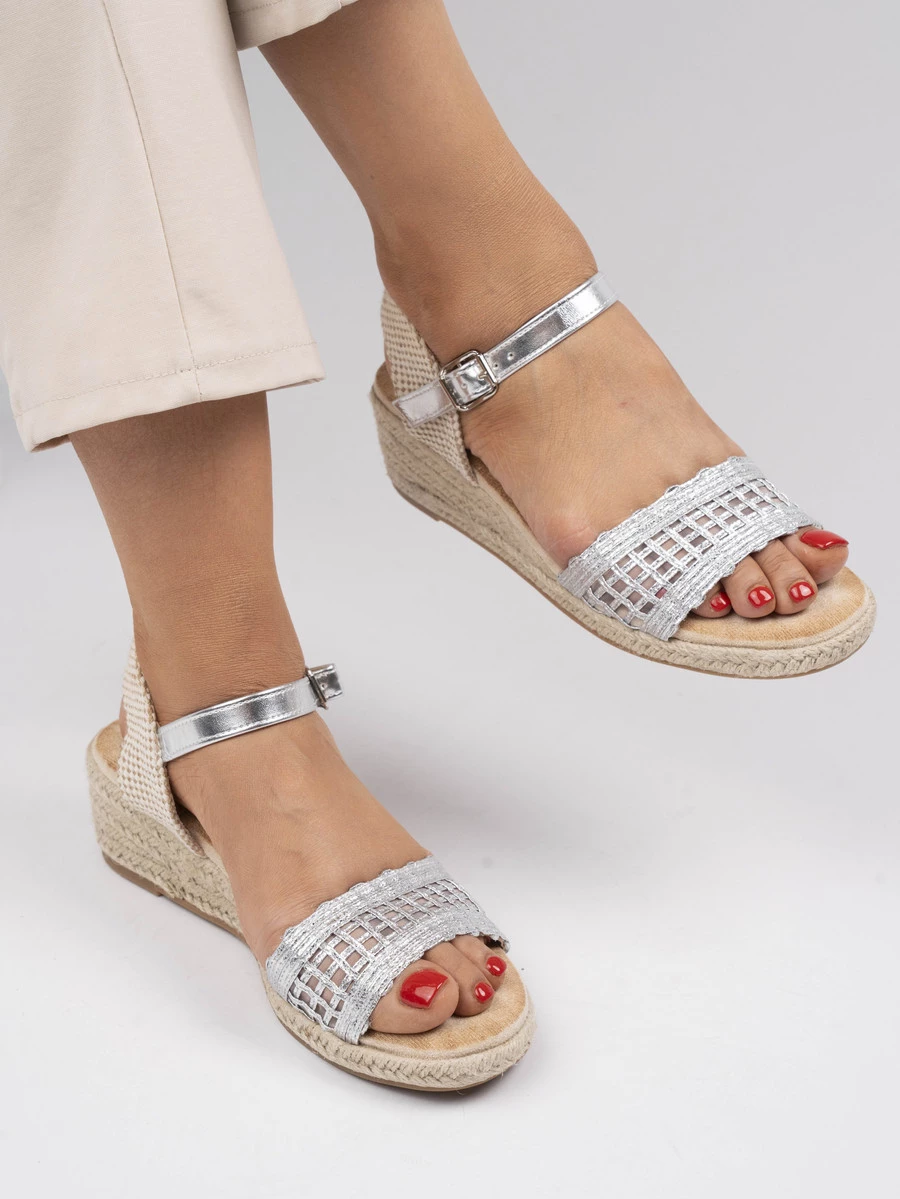 Sandały na koturnie z ażurowym wzorem i plecioną podeszwą Silver