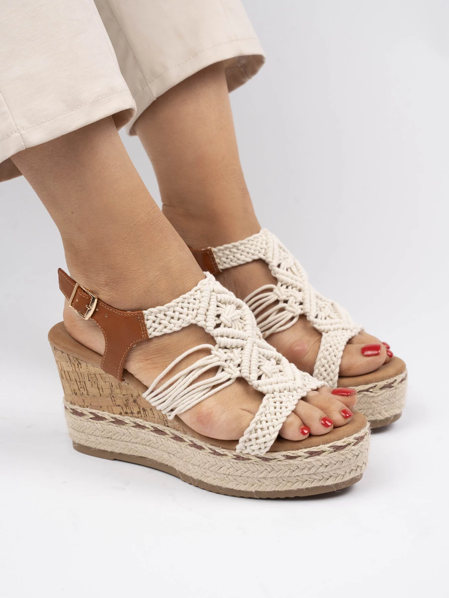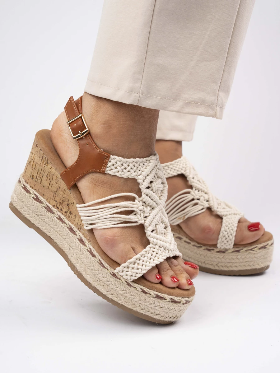 Sandały na koturnie z plecioną cholewką w kolorze Off