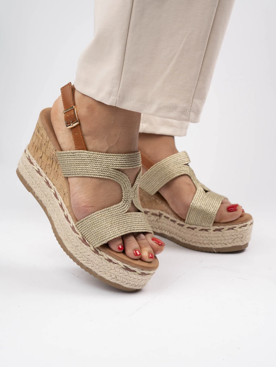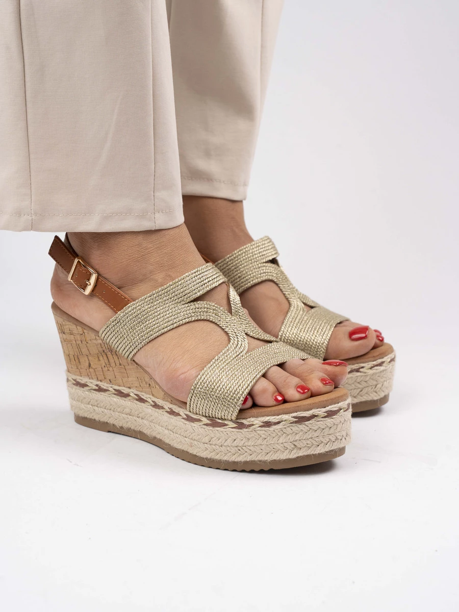 Sandały na koturnie z plecioną tkaniną i złotą klamrą Gold