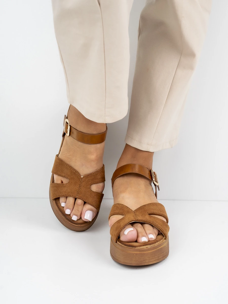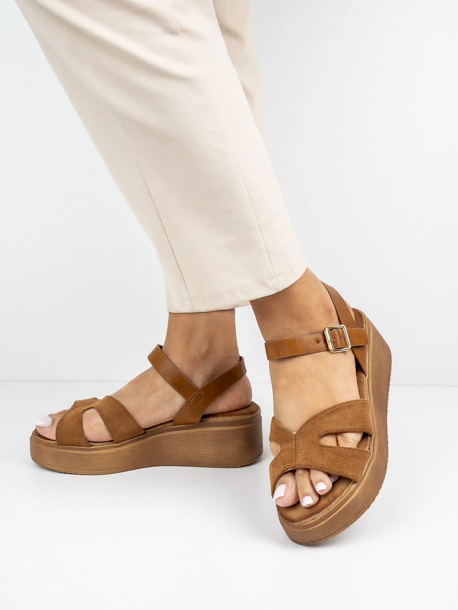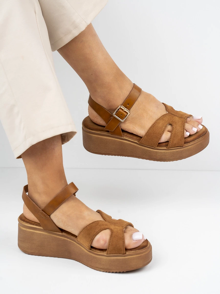 Sandały na koturnie z regulowanym paskiem w kolorze Camel