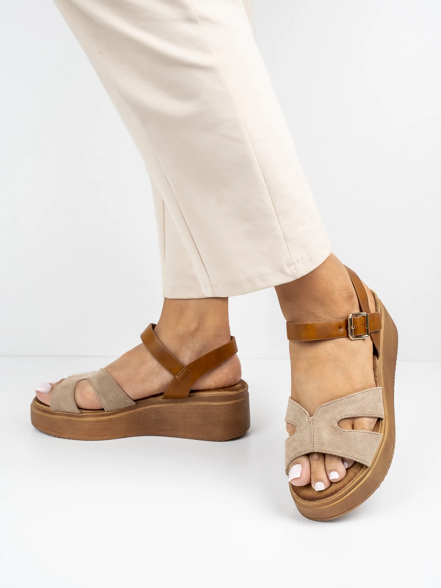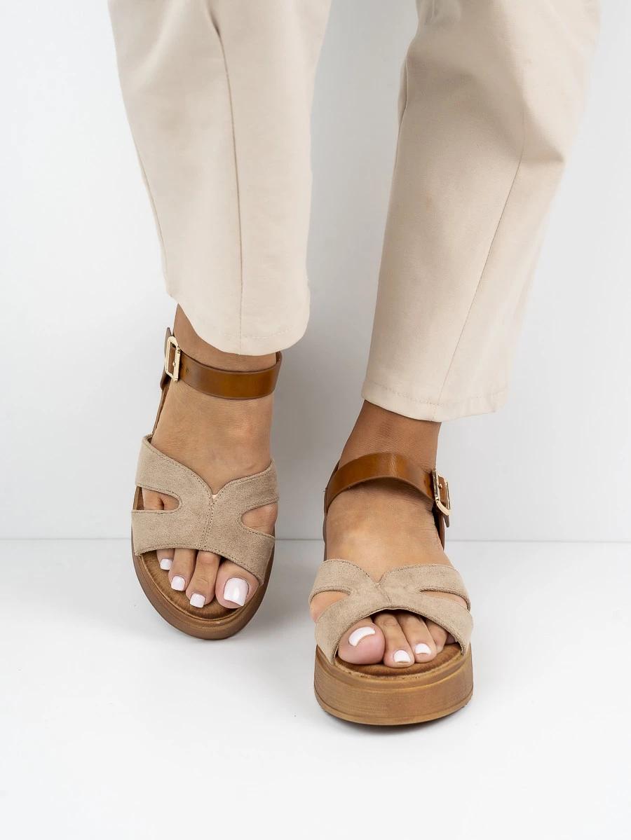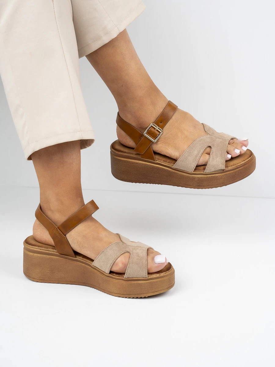 Stylowe sandały na koturnie z zamszowymi paskami i klamrą zapewniającą idealne dopasowanie. Wygodne i eleganckie, doskonałe na letnie dni w kolorze Khaki.