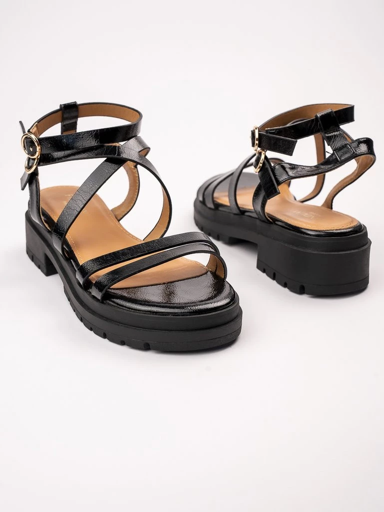 Stylowe sandały na obcasie z eleganckimi paskami i ozdobną klamrą w kolorze Black. Idealne na letnie wyjścia, zapewniają komfort i modny wygląd.