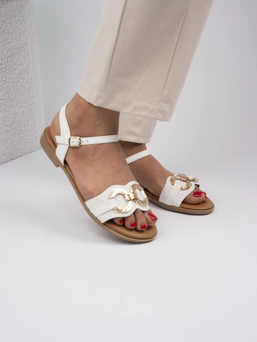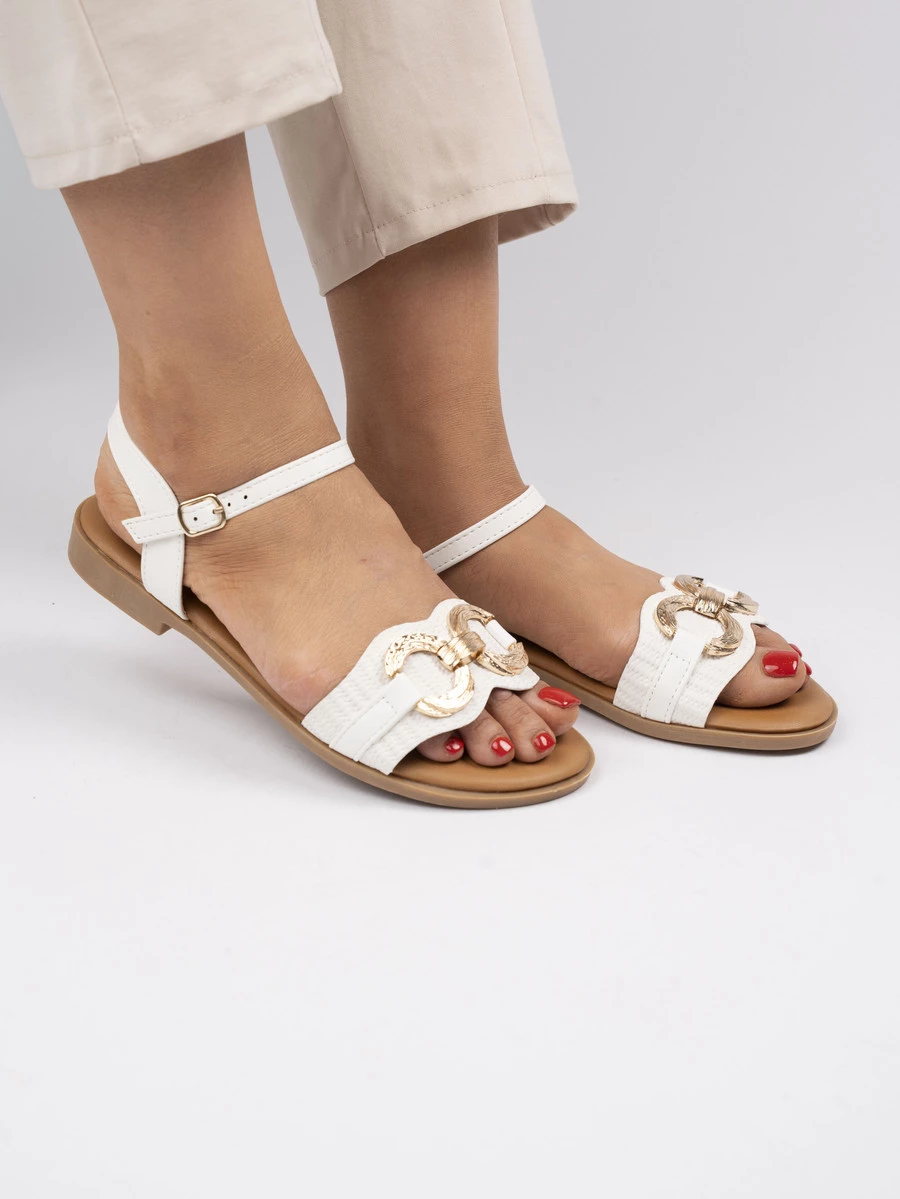 Te eleganckie sandały płaskie wyróżniają się subtelnym, ale efektownym designem, idealnym na letnie dni. Wykonane z wysokiej jakości skóry, zapewniają komfort podczas całodziennego noszenia. Złota ozdobna klamra dodaje im stylu i elegancji, czyniąc je idealnymi do codziennych i oficjalnych stylizacji. Regulowane zapięcie pozwala na idealne dopasowanie do stopy, co zwiększa wygodę użytkowania. Te sandały w kolorze White doskonale komponują się zarówno z casualowymi, jak i bardziej eleganckimi stylizacjami.