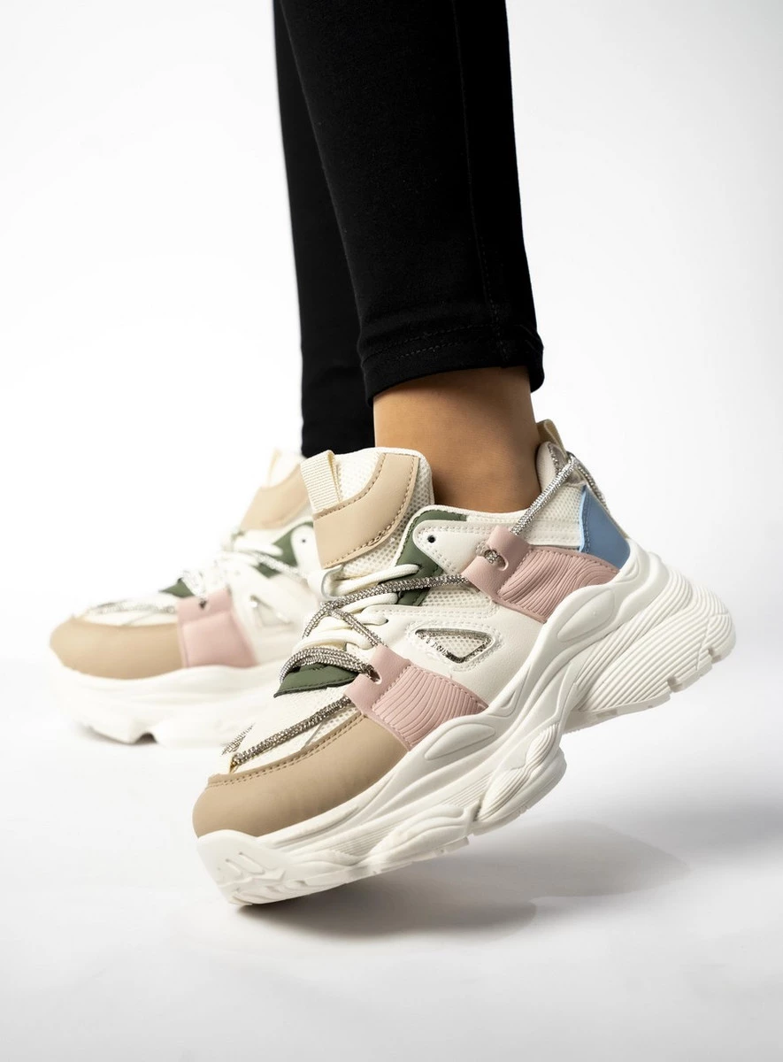Sznurowane sneakersy – buty sportowe damskie. Najmodniejsza w tym sezonie masywna i ultranowoczesna podeszwa o wysokości 5 cm idealnie komponuje się z różnorodnymi dodatkami – błyszczącymi sznurówkami… Przekonaj się sama jak dodadzą charakteru Twoim stylizacjom : ) Wnętrze butów wyścielone jest tkaniną. Materiał zewnętrzny – skóra ekologiczna + tkanina.