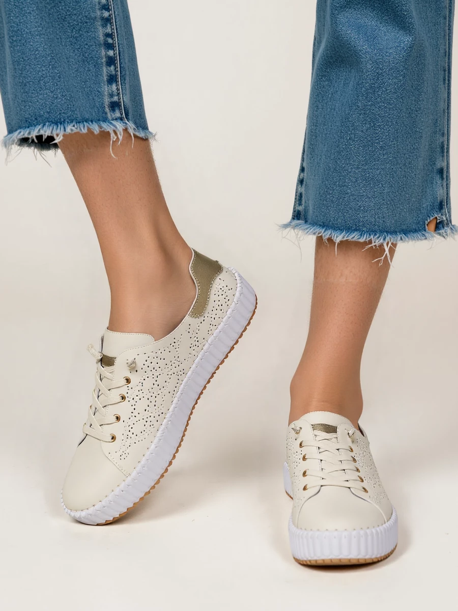 Trampki Aurora Beige to wyjątkowe obuwie, które łączy elegancję z komfortem. Dzięki delikatnym wycięciom i beżowemu kolorowi, są idealne na codzienne spacery i spotkania. Wykonane z wysokiej jakości materiałów, zapewniają długotrwałą wygodę i styl, idealne zarówno do casualowych, jak i bardziej eleganckich kreacji.