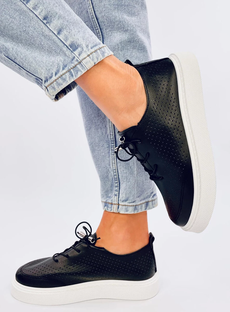 Trampki damskie ażurowe. Wykonane są z delikatnej skóry ekologicznej o dziurkowanej fakturze. Najmodniejsza, wysoka podeszwa tych butów sprawi, że zechcesz zabrać je na każdy spacer : ) Zgrabnie prezentują się na nodze i są niesamowicie wygodne… Wkładka wewnętrzna – tkanina.